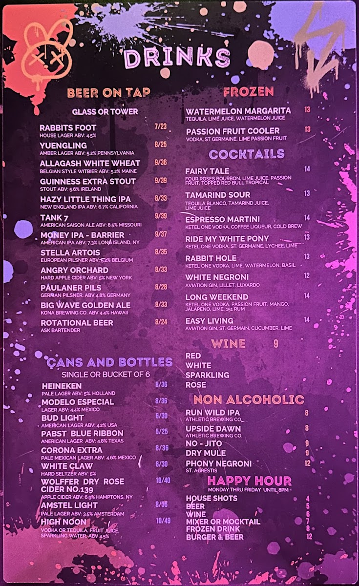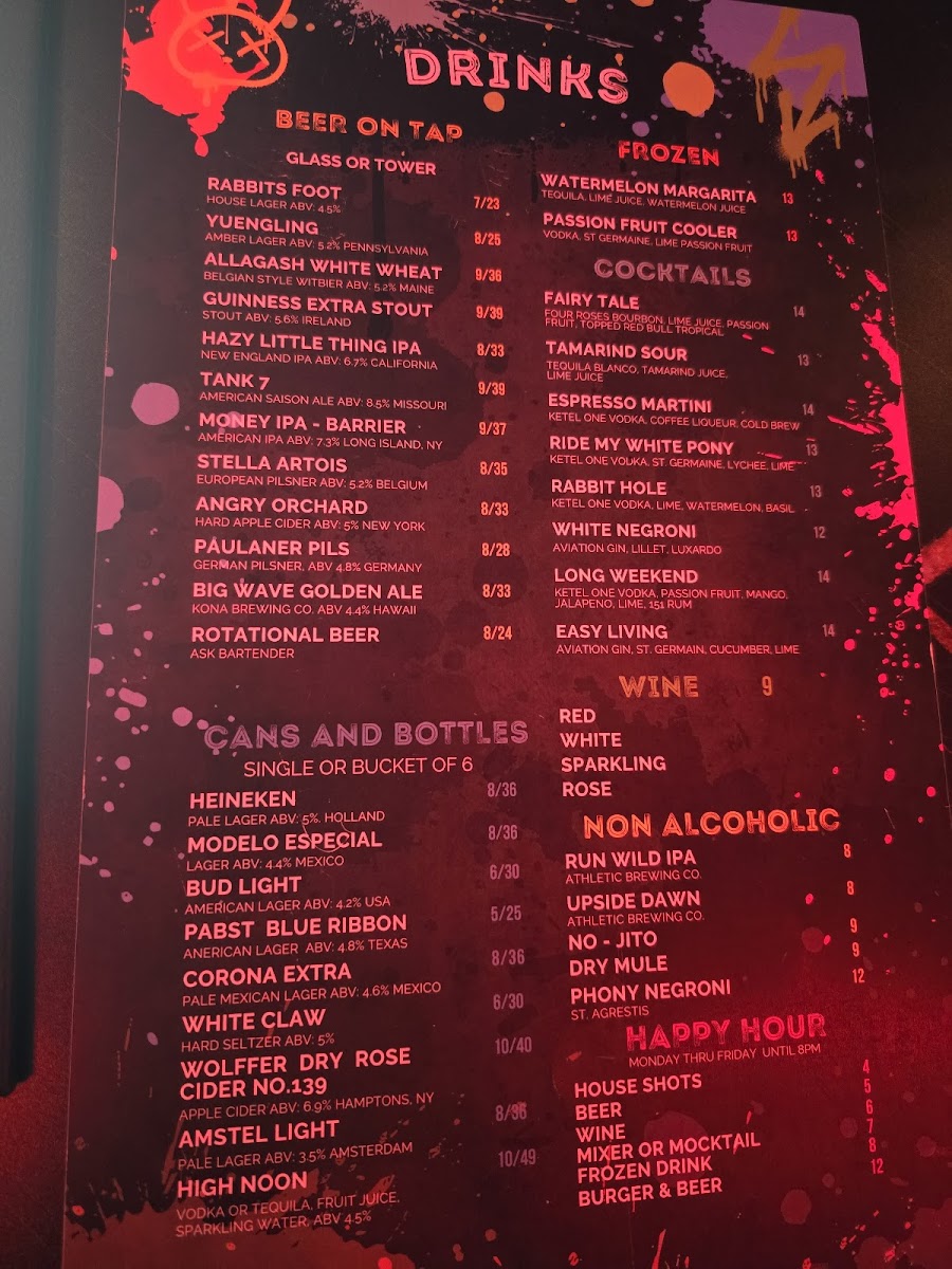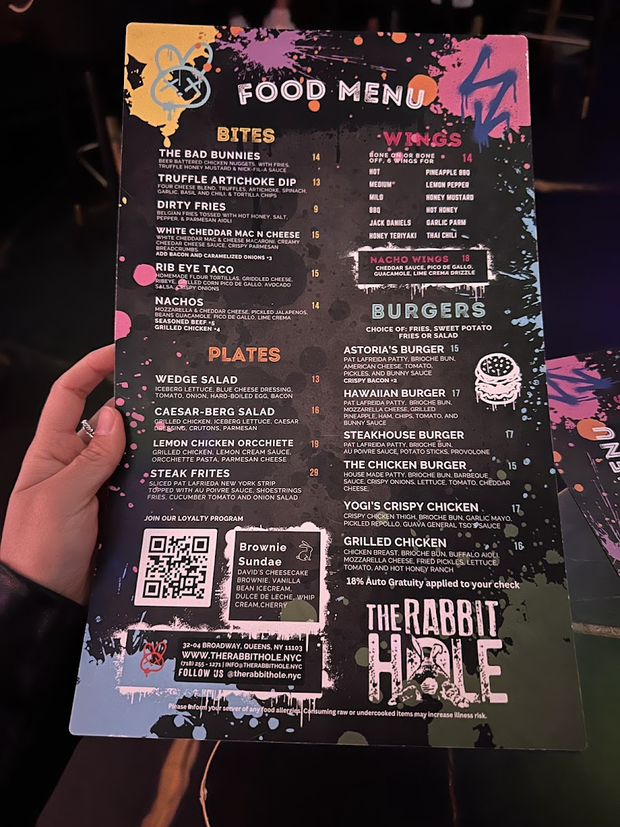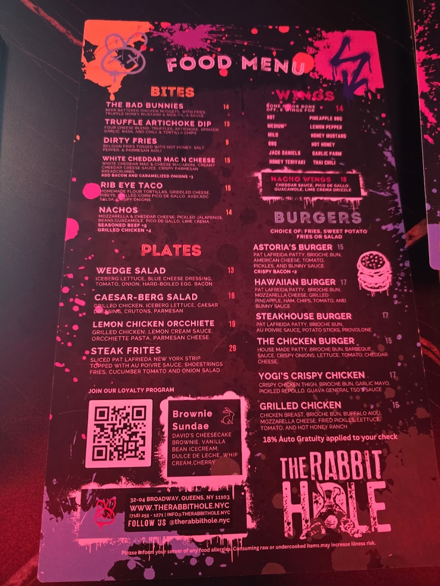 Welcome to The Rabbit Hole Astoria, a hidden gem located at 38-04 Broadway, Astoria, NY. This vibrant venue is perfect for casual hangouts or celebratory nights out. Its diverse menu promises something for everyone. Start with the Buffalo Chicken Wrap, featuring grilled chicken drenched in spicy buffalo sauce paired with creamy blue cheese, or savor the CaesarBerg Salad, a fresh mix of grilled chicken and crunchy croutons. For meat lovers, the NY Strip, topped with au poivre sauce, will satisfy your cravings.